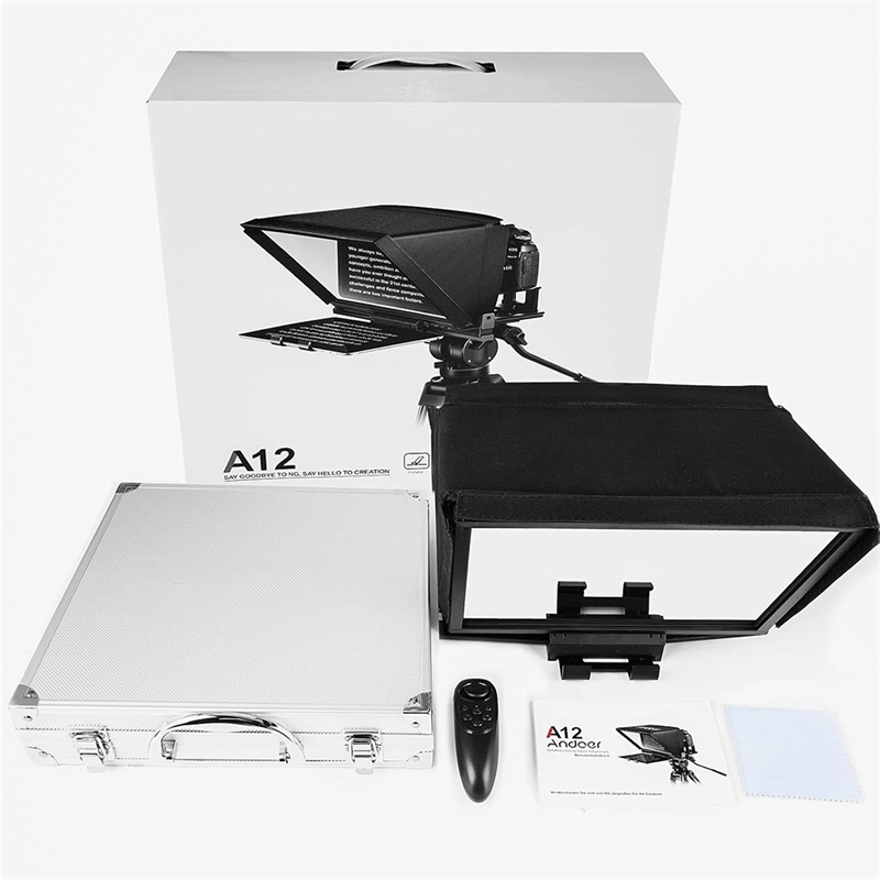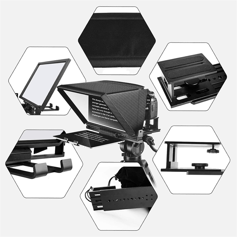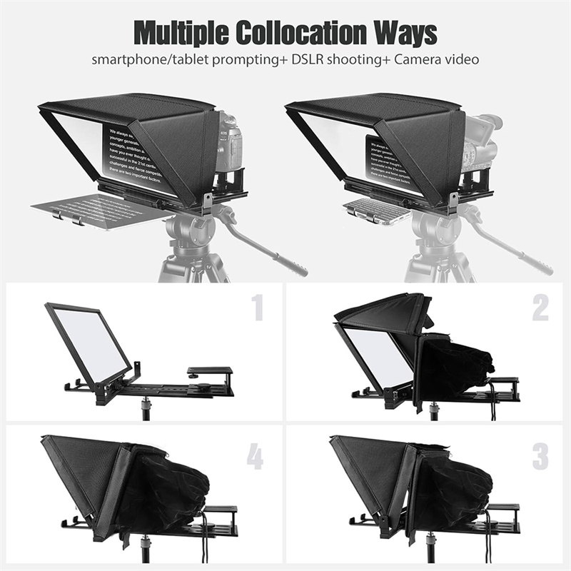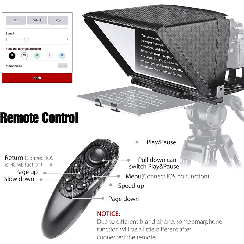 【Easy to Read with HD Display】Thanks to an innovative coating technique, the high quality beam splitter glass ensures 75% light transmittance. With its adjustable hood and leading technology glass, the text on your tablet is clearly reflected onto the high definition display of the teleprompter. The reflected text can be read up to 10’/ 3m away. Note:It is NOT compatible with wide angle lens and the focal length of camera lens needs to be more than 28mm. 【Upgraded Smart Control】 The MagicLine teleprompter supports intelligent control via the included RT-110 remote control and the InMei teleprompter app. You can easily pause, speed up or slow down, and turn pages with just one simple press. Pair the RT-110 remote control with your smartphone in our NEEWER teleprompter app via Bluetooth connection, rather than a direct Bluetooth link from your smartphone or tablet 【Effortless Assembly】 With clear instructions for installation, the teleprompter can be set up within minutes. The collapsing design allows for easy storage and transport. The dual cold shoe mounts and 1/4" threads on both sides, as well as the full body of aluminum alloy, make this teleprompter lightweight yet durable enough to hold your camera, tablet, microphone, LED lights and other accessories in place while making videos 【Effortless Assembly】 With clear instructions for installation, the teleprompter can be set up within minutes. The collapsing design allows for easy storage and transport. The dual cold shoe mounts and 1/4" threads on both sides, as well as the full body of aluminum alloy, make this teleprompter lightweight yet durable to hold your camera, tablet, microphone, LED lights and other accessories in place while making videos. Fits most tripods like video, ball head tripods for stable videography 【Wide Compatibility】 The teleprompter can fit all models of smartphones or tablets up to 9.84" x 8.68" / 25cm x 22cm, compatible with iPad iPad Air iPad Pro 11", etc. Its lens hood can be adjusted to suit cameras and mobile phone lenses of various sizes. Note: NOT compatible with iPad Pro 12". The upgraded InMei teleprompter app is compatible with iOS 11.0 or later / Android 6.0 or later 【Package Contents】 1 x MagicLine Teleprompter, 1 x RT-110 Remote Control, 1 x Phone Holder, and 1 x Carrying Case (the upgraded NEEWER Teleprompter App is available for download in App store, Google play)