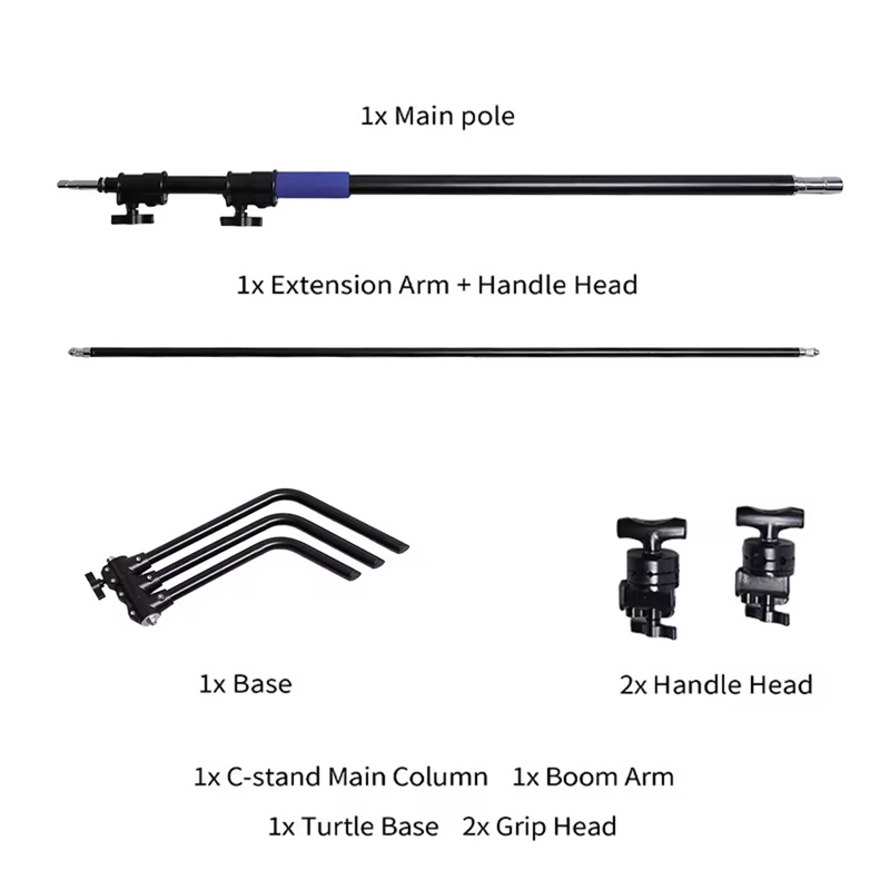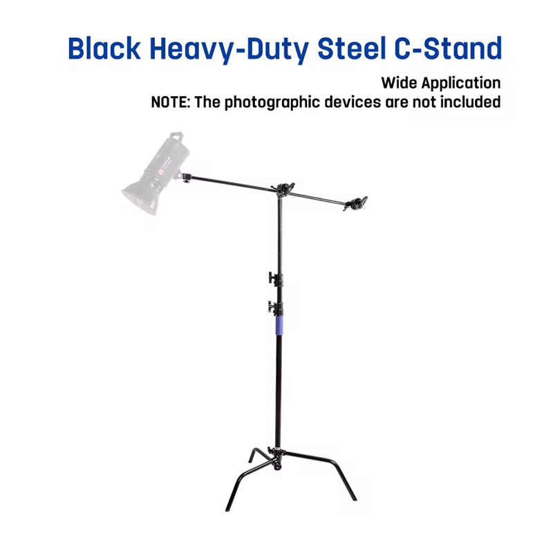 ★What Is A C-Stand For Photography? C-Stands (also known as Century Stands) was originally used in the early days of cinema production, where they were used to hold up large reflectors, that reflected the sunlight to illuminate the movie set before the introduction of artificial lighting. ★Black Finish This Black Turtle-Based C-Stand For Photography features a black finish, designed to absorb stray light, preventing it from reflecting back onto your subject. Ideal for situations where you need to place your c-stand very close to your subject and need the utmost control of the light ★Heavy-Duty Stainless-Steel C-Stand For Photography Made from high-strength Stainless steel, the Prime Focus Black Stainless Steel Century C-Boom stand can take loads of up to 10kg in weight. This makes it great for use with heavier light and modifier combinations. ★Versatile Accessory Arm And Grip Heads The Prime Focus Black Stainless Steel Century C-Boom comes with a 50-Inch Accessory Boom arm, and 2x 2.5-inch Grip heads. The accessory arm mounts to the c-stand via one of the grip heads, and the other can be used to hold various accessories, such as flags and scrims etc. The Grip arm itself features a standard 5/8-inc stud at either end enabling you to mount lights or other accessories directly to the arm. ★5/8-Inch Baby-Pin Connection The Prime Focus Black Turtle-Based C-Stand For Photography features the industry-standard 5/8-inch baby-pin connector, making it compatible with virtually any light currently on the market. ★Detachable Turtle Base The Prime Focus Black Turtle-Based C-Stand For Photography features a detachable turtle base, making this C-Stand easy to store and transport. The legs feature a standard 1-1/8-inch Junior-Pin Receiver, enabling you to use the legs themselves as a floor stand when used in conjunction with a Junior-Pin to Baby-Pin adapter (available separately). It can also be used as a low stand for large production lights, such as Arri lights. ★Spring-Loaded Dampening System Prime Focus 340cm C-Stand features a spring-loaded dampening system, which absorbs the impact of any sudden drops, should you accidentally release the locking mechanism. ★Packing List: 1 x C stand 1 x Leg base 1 x Extension arm 2 x Grip head
