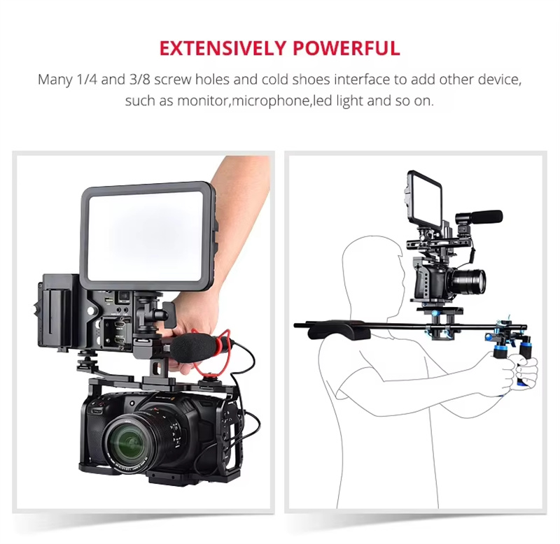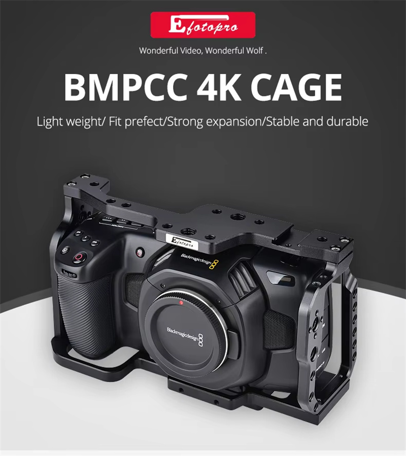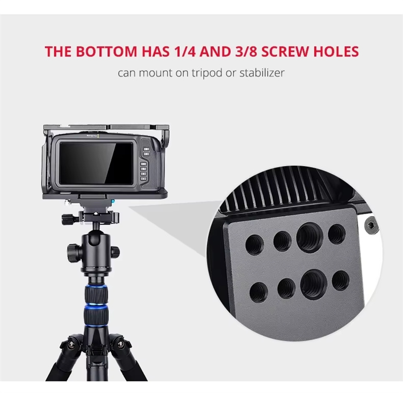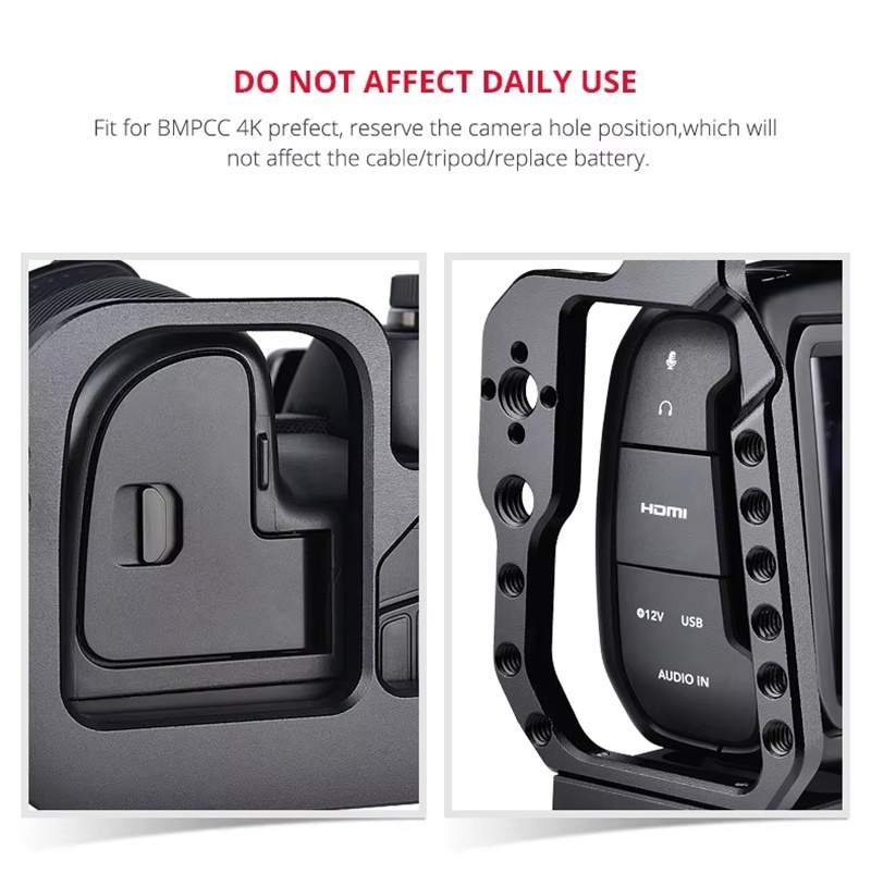 Aviation aluminum material, light and strong to ensure stability to reduce shooting pressure. Quick release design and install, one button tightening, easy to install anddisassemble, solve the user's installation and disassemble problemMany 1/4 and 3/8 screw holes and cold shoes interface to add other devicesuch as monitor, microphone, led light and so on. The bottom has 1/4 and 3/8 screw holes, can mount on tripod or stabilizer. Fit for BMPCC 4K prefect, reserve the camera hole position, which will not affectthe cable/tripod/replace battery.