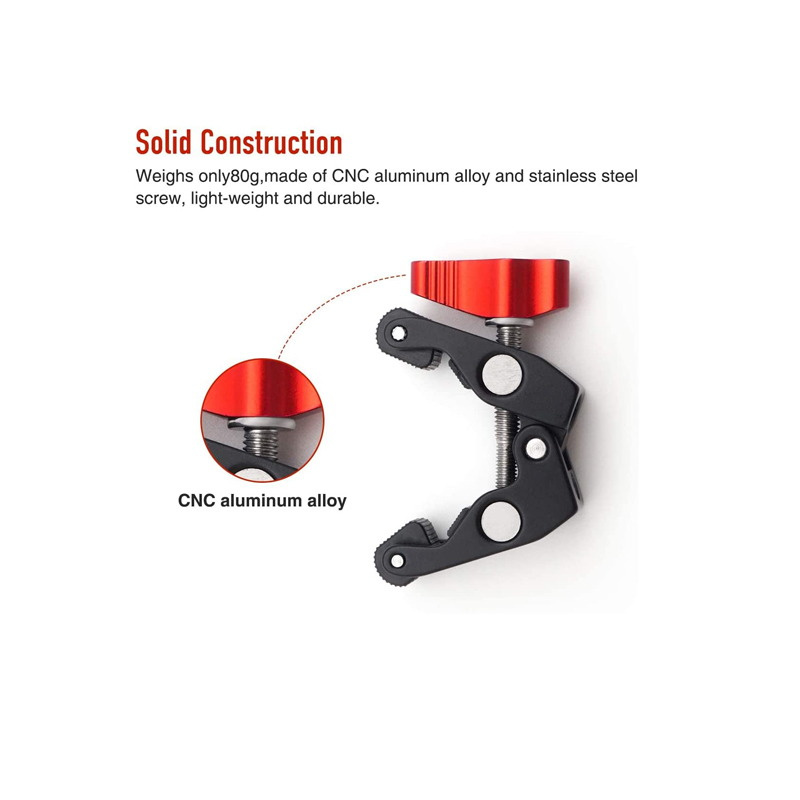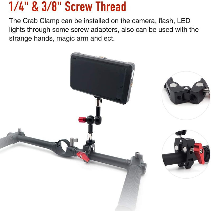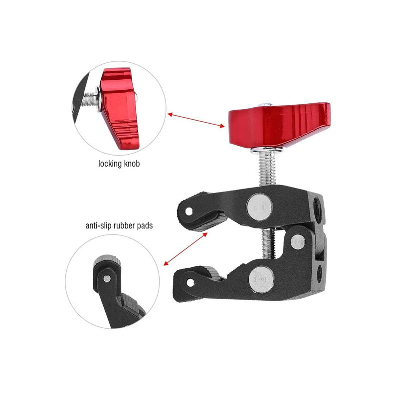 1. This Super clamp is made of solid anti-rust stainless steel metal and black andodized aluminum alloy for high durability. 2. Non-slip rubbers on the inner side provide strength and stability. 3. It has a female 1/4"-20 and a 3/8"-16, both the standard fitting sizes in the photo industry for heads and tripods can be used for a variety of attachments. 4. Small size super clamp, ideal for articulating magic friction arm. Max. load up to 2kg. 5. If equipped with a magic arm (not included), they will be able to connect to a monitor, a LED video light, flash light and others.