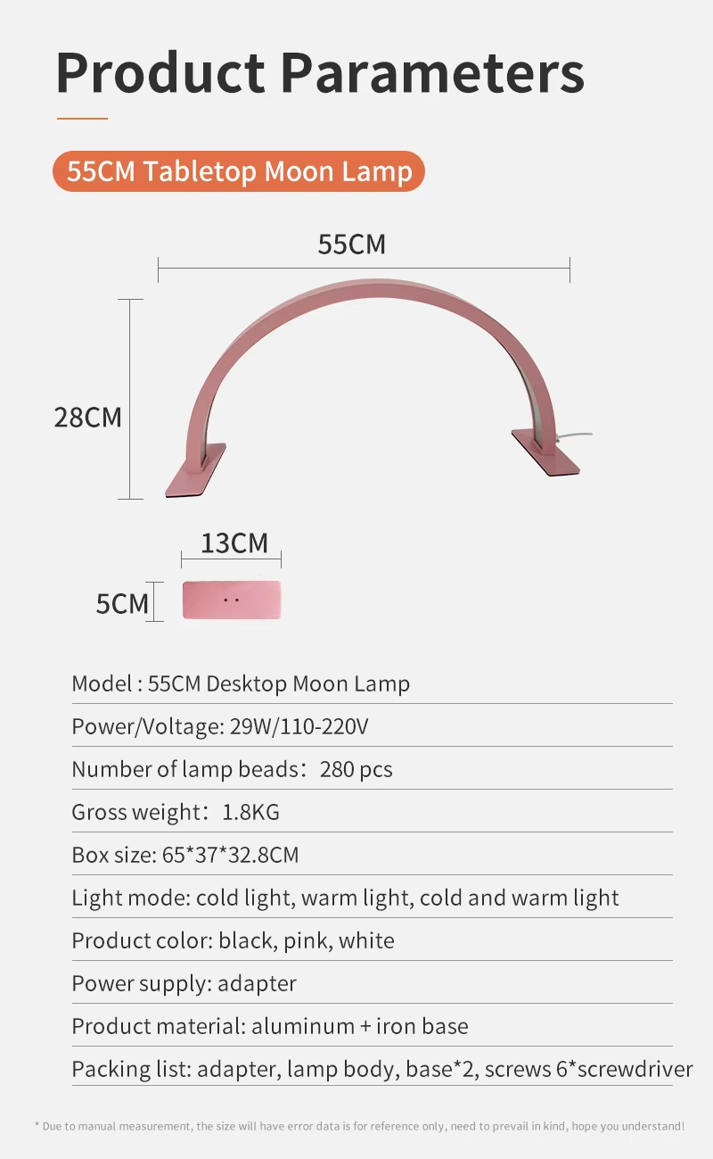 Brand: magicLine Model:55CM Desktop Moon Lamp Power/oltage:29W/110-220V Numberoflamp beads: 280 pcs Lamp Body Material:ABS Gross weight: 1.8kG Light mode: cold light, warm light, cold and warm light Working Time (hours):60000 Light Source:LED
