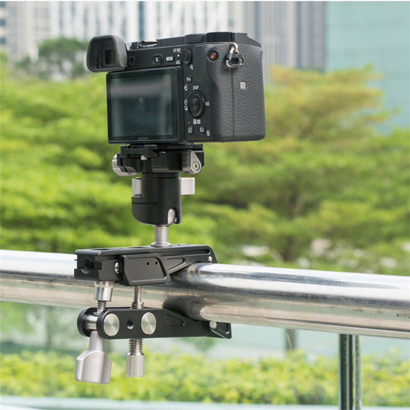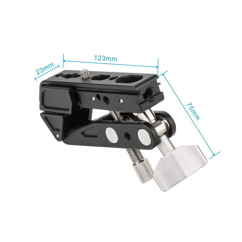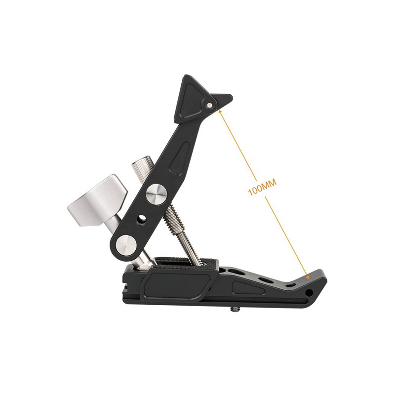 1. Solid Construction: Made of CNC aluminum alloy and stainless steel screw, light-weight and durable. 2. Wide Using Range: The Super Clamp is a versatile tool that holds just about anything: cameras, lights, umbrellas, hooks, shelves, plate glass, cross bars, used in photography equipment setup and other work or normal life environment. 3. 1/4" & 3/8" Screw Thread: The Crab Clamp can be installed on the camera, flash, LED lights through some screw adapters, also can be used with the strange hands, magic arm and ect. 4. Well Designed Adjust Knob: The locking and opening of the mouth are controlled by the CNC Knob, simple operation and saving energy. This super clamp is easy to install and quick remove. 5. Non-slip Rubbers: Meshing part is covered with non-slip rubber pad, it can increase the friction and reduce scratches, make the installation closer, stable and safe.