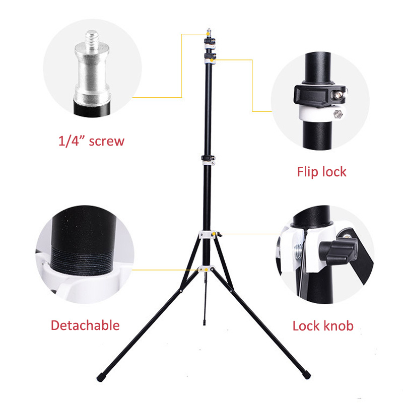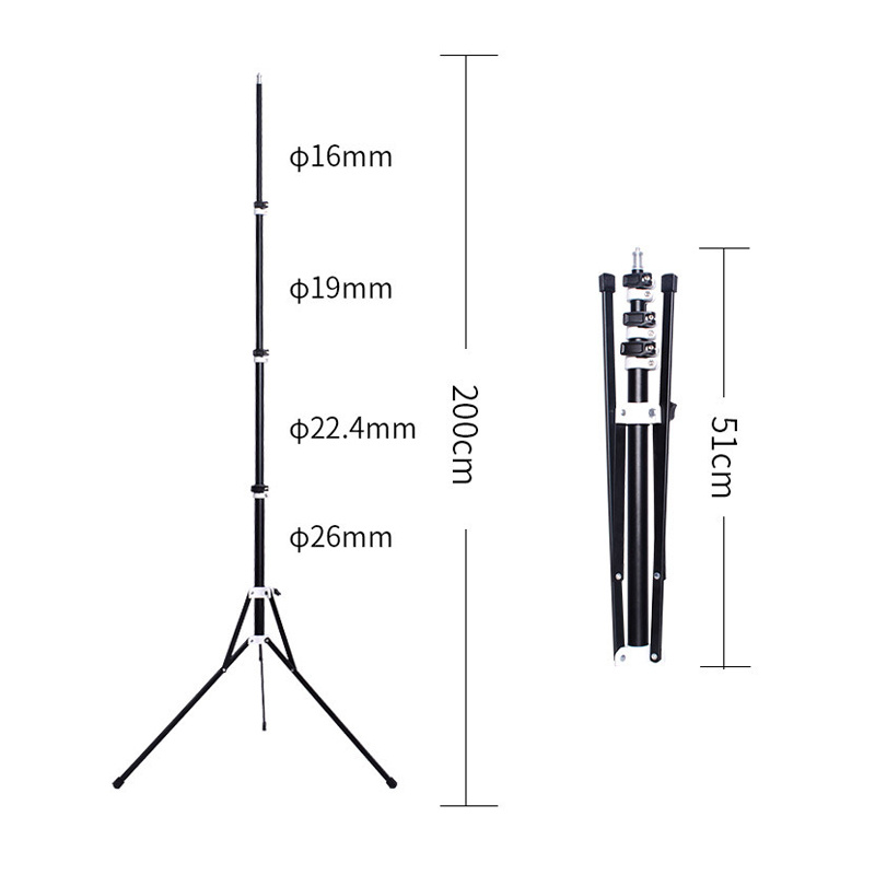 Brand: magicLine Max. height: 200cm Min. height: 51cm Folded length: 51cm Center column section : 4 Center column diameter: 26mm-22.4mm-19mm-16mm Safety payload: 3kg Weight: 1.0 kg Material : Aluminum Alloy+Iron+ABS