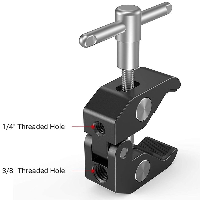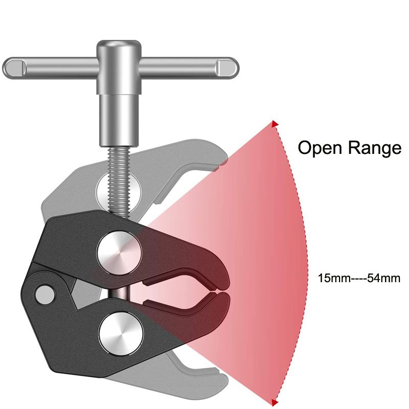 1. Ajustable Jaw: The jaw opens to max. 54mm and mini. 15mm. You can clip it on anything less than 54mm thick and more than 15mm. 2. For More Accessories: The clamp features 1/4’’ threaded holes and 3/8 threaded hole, which allow you to attach more accessories. 3. High-Quality: This super clamp is made of solid anti-rust stainless steel + black anodized aluminum alloy for high durability. 4. Better Protection: The updated rubber pads on the clamp parts prevent your application from slipping and scratching. 5. Versatility: The super clamp is designed to mount onto anything like cameras, lights, umbrellas, hooks, shelves, plate glass, cross bars, even other Super Clamps.