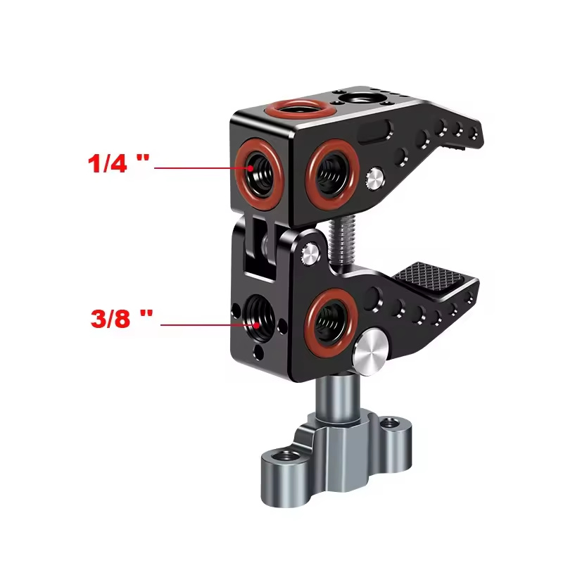 ★Compatible with rod or surface between 14-50mm, can be fixed on tree branch, handrail, tripod and light stand etc. ★This clamp mount features multiple 1/4-20” threads(6), 3/8-16” threads(2) three ARRI Style threads. ★The clamp also includes (1) 1/4-20” male to male thread adapter for interfacing to ball head mounts and other female threaded assemblies. ★T6061 grade aluminum material body, 303 stainless steel adjusting konb. Better grip and impact-resistant. ★Ultra size locking knob effectively increase locking torque for easy operation. Ergonomically-designed to adjust clamping range conveniently. ★Embeded rubber pads with kurnling increase friction for clamping safety and protect equipment from scratches at the same time.