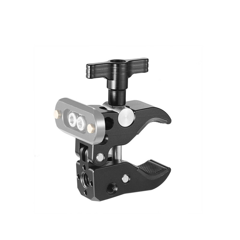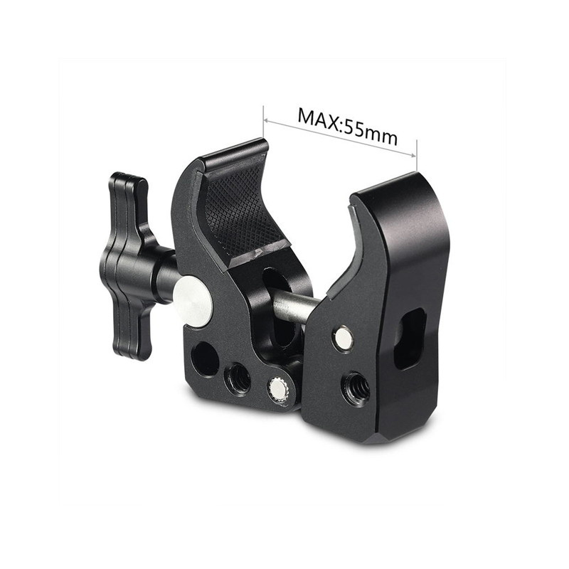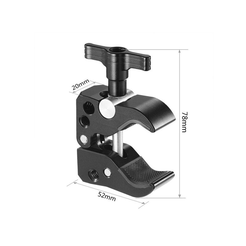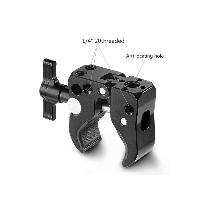 1. It comes with two 1/4” threaded holes and 1 Arri locating hole on the back making possible attaching a mini nato rail and an Arri locating magic arm. 2. The jaw is fitted with rubber pads on the inside removing the wear and tear of the rod it clamps on. 3. Durable, robust and secure. 4. Perfectly suitable for video-shooting via two types of mounting points. 5. T-handle fits fingers well enhancing comfort.